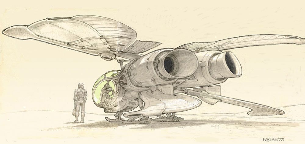 The first attempts to bring ‘thopters to the screen came courtesy of Alejandro Jodorowsky, whose abortive film version of Dune in the ‘70s gave concept artists like Ron Cobb ample runway to envision the kinds of buglike ‘thopters his wild take on the material would allow. Other designs made for more hawk-like profiles, befitting the bird at the center of the Atreides crest. But as imaginative as these designs would be, we’ll never know how they would have panned out on screen — especially given the resources and special-effects capabilities of the time.