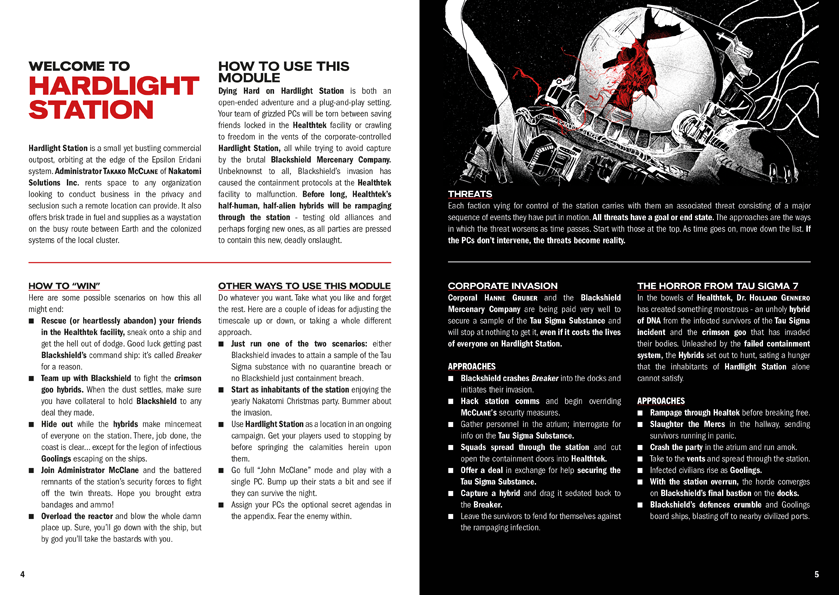 Dave Kenny, who authored the supplements Dying Hard on Hardlight Station and Nirvana on Fire, is also an evangelist for the system, describing the ‘secret formula’ as “its clear vision both in its blue-collar, hard sci-fi aesthetic and in the unity of its stripped-down rules and matching graphic design.” He continues: