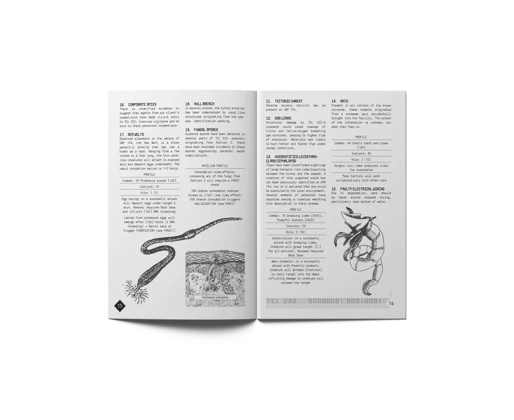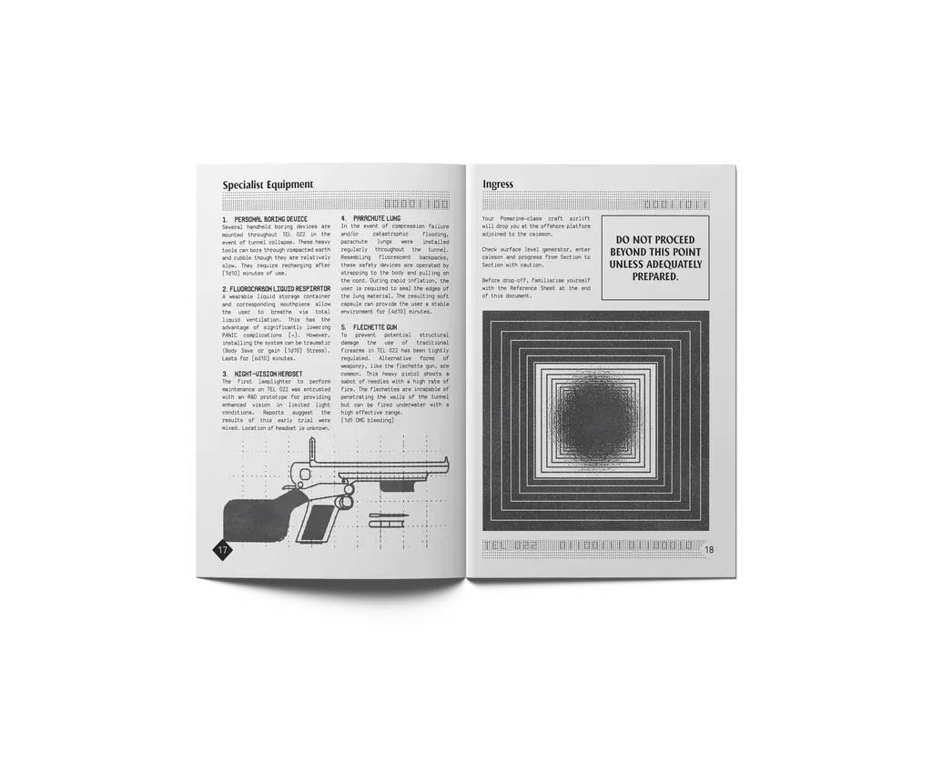 Part of what helped maintain that level of interest is aside from releasing their own adventures and supplements – such as A Pound of Flesh, which includes rules for designing your own sketchy af space stations – there is a vibrant third-party scene. Part of the attraction is the lack of fussy proprietorial worldbuilding. Different creators have come in, offering radically different takes that share only a rules system and production values – generally zine-style booklets with a low price point that belies the richness of the illustration, graphic design, great typography, and rich paper stock.