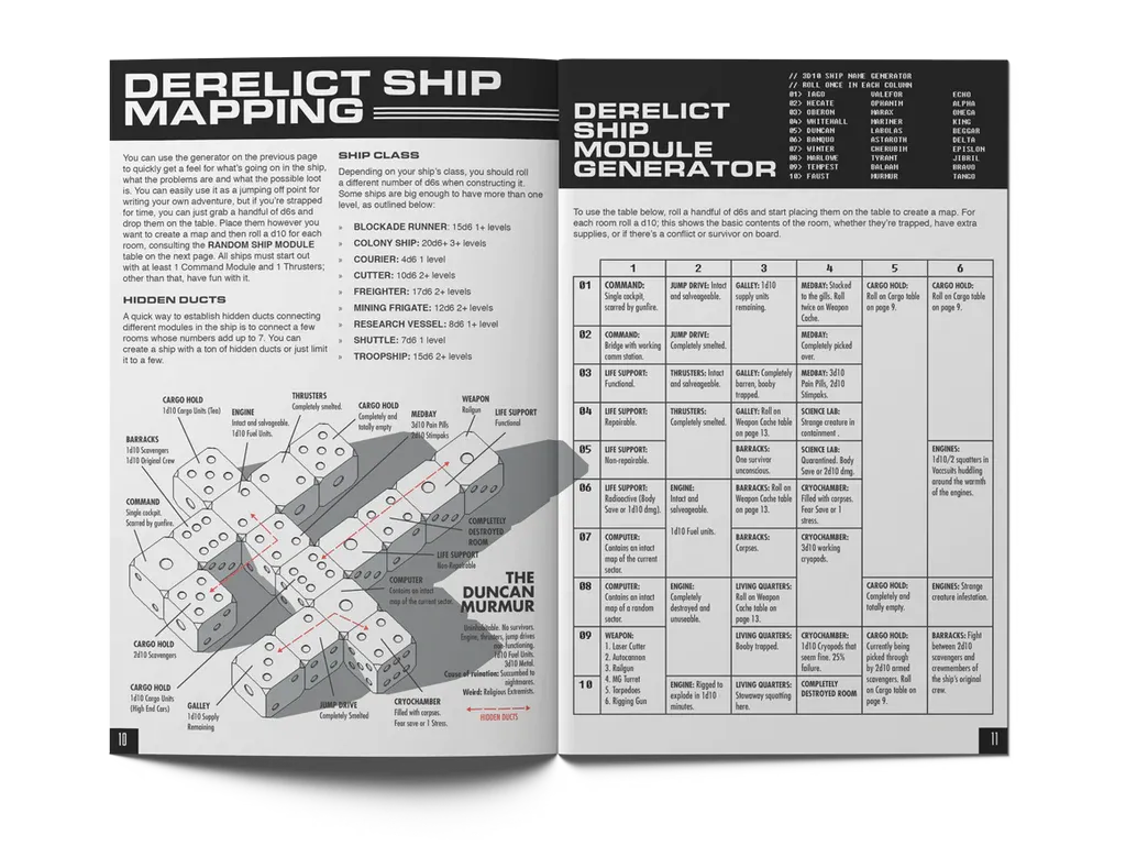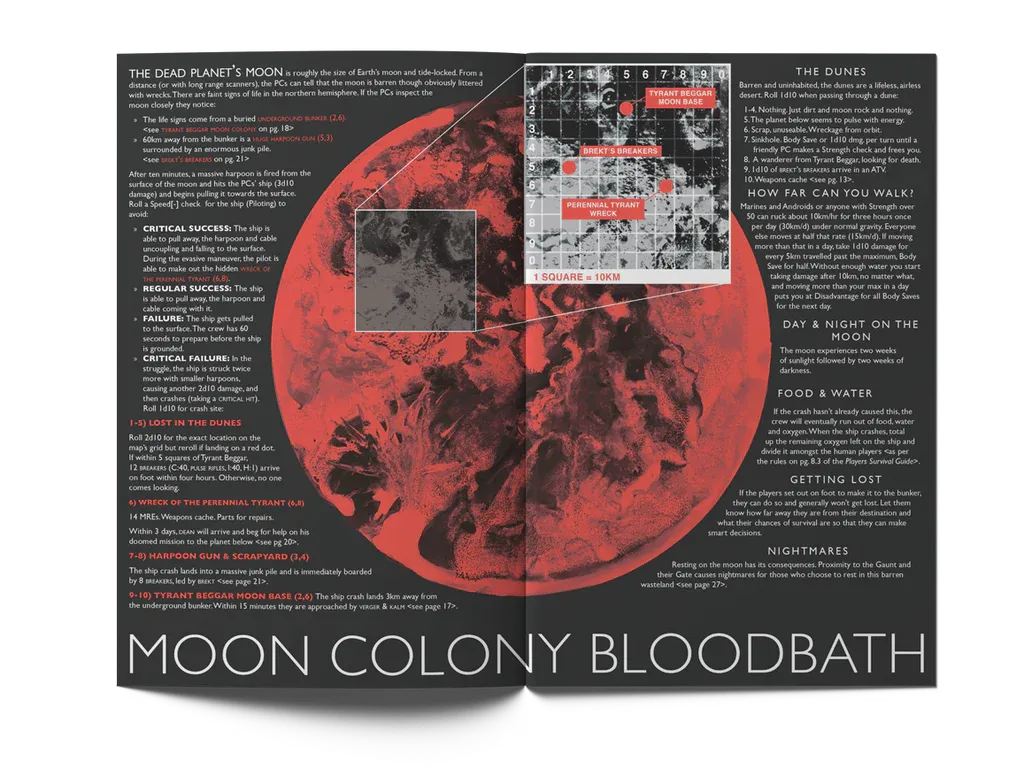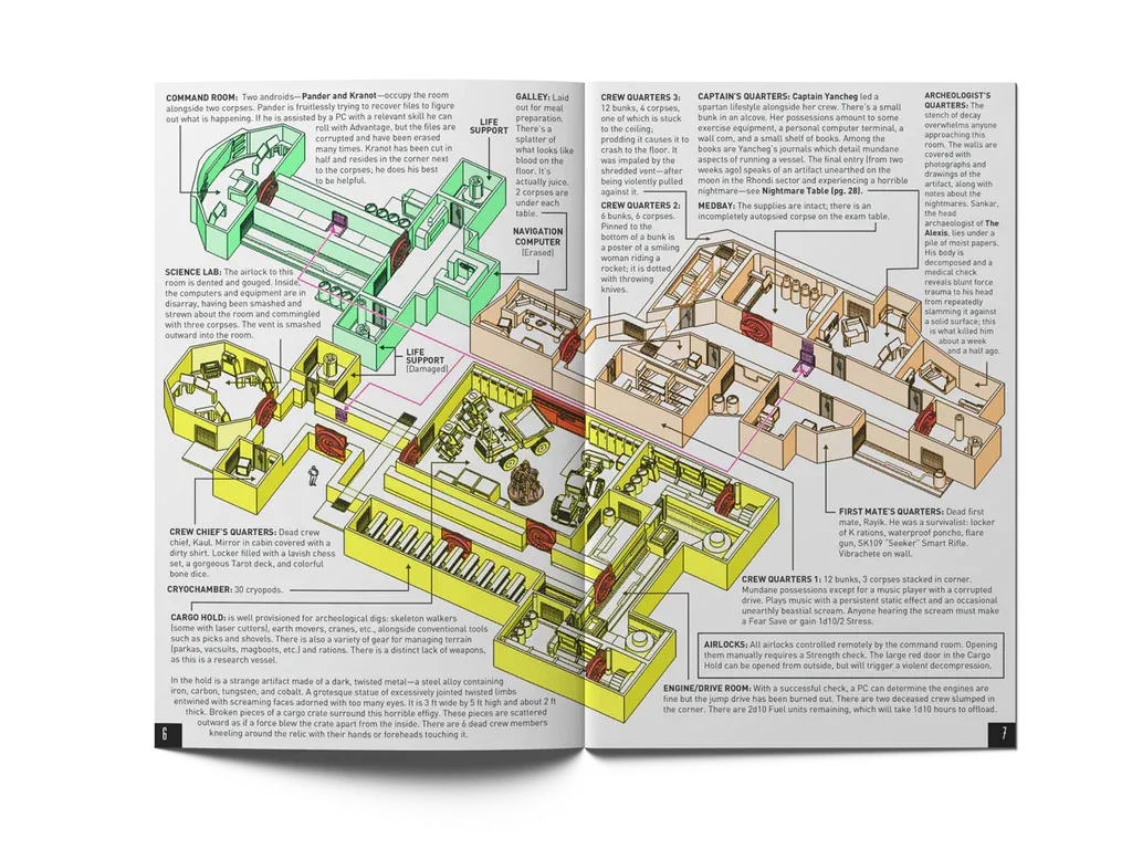 “I came across this idea of exploring a giant alien mothership almost like a hex crawl,” says McCoy, “and I started to realize all the things I loved about OSR games—high stakes, lethality, exploration, puzzle solving—all of those were prevalent in sci-fi horror. And best of all that genre had been woefully underserved in RPGs at the time. We got in at the very beginning of a trend in RPGs, now there are maybe a dozen or more sci-fi horror games on the market. So from this idea, I basically decided to spend zero time on the system, which felt like quicksand. I used a bare-bones D100 system because I knew it would work and because percentiles sound science fiction-y. I added one small stress and panic subsystem to make the core unique.”