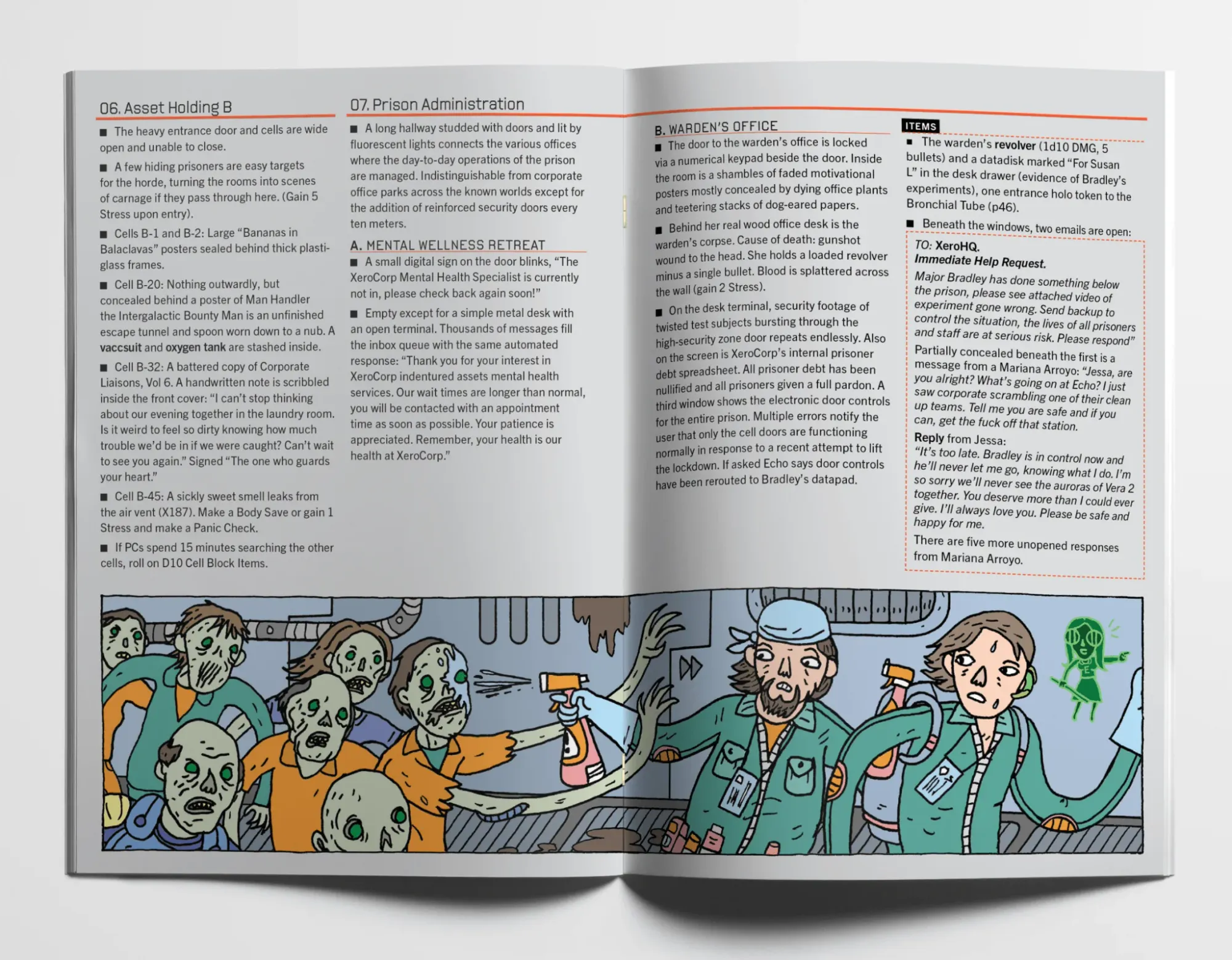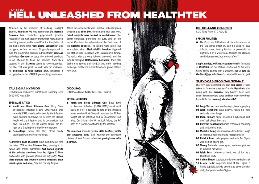 “I think the key to remember is that at its core we’re interested in fun,” answers McCoy. “Players being scared is largely on them and where they’re at and whether they’re open to experiencing that kind of emotion. Talk with your players about what they want and see if you can hit that, but don’t feel bad if no one is scared to play your game. The setting and the environment are sci-fi horror, but in my experience, the mood at the table is almost always laughter and shenanigans, no matter what the genre is.”