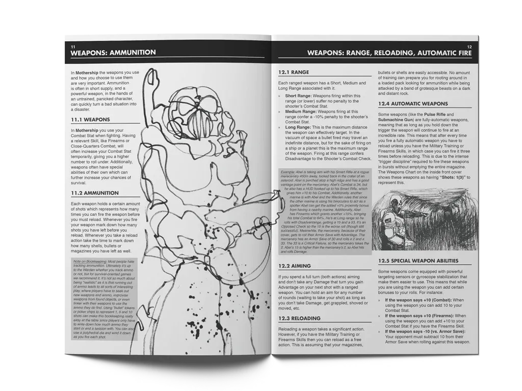The first game of Mothership was played at GenCon 2017 with a small group of friends and a few “scraps of graph paper.” The basic rules set was condensed into a “pocketmod” – designed to be printed onto a single sheet of paper and folded to create a simple booklet – that McCoy hoped to expand to a full-blown zine.
