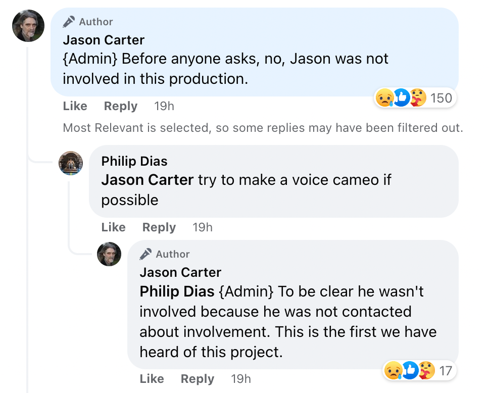 A representative of Jason Carter, who played the Ranger Marcus Cole in Babylon 5 Seasons 3 and 4, posted on Facebook to confirm he’s not involved.