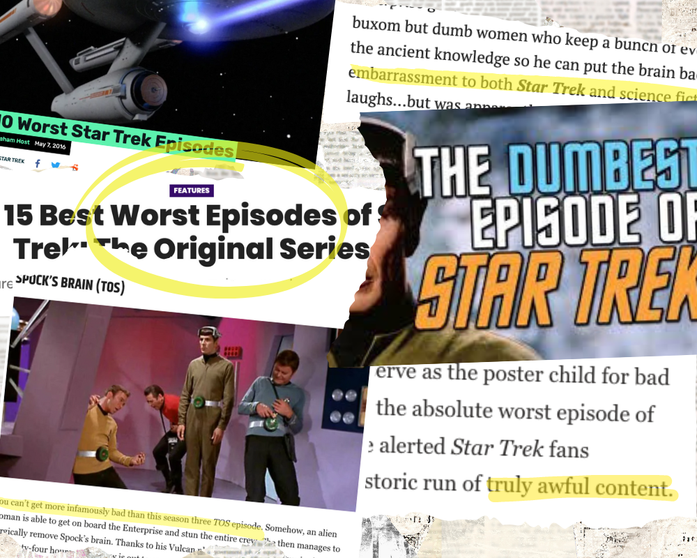 Let’s put something to bed – by any provable metric ‘Spock’s Brain’ is not the worst ever episode of Star Trek. Shatner, Nimoy, Nicholls, entertainment magazines, et al – none of them have actually been able to prove this status, they just state their own subjective views, based on personal recall and the myth that has grown up around its alleged badness. No scientific, episode-by-episode analysis has yet to come up with credible, measurable, appropriate rating categories that can be applied to each episode to determine an overall score.