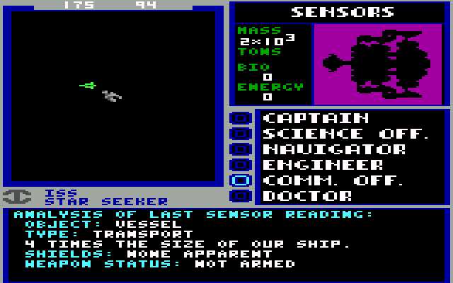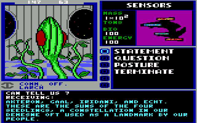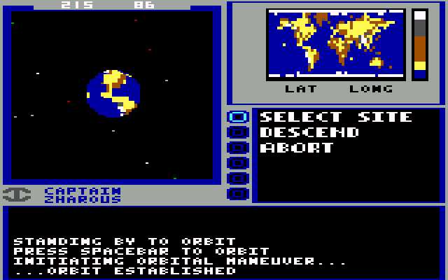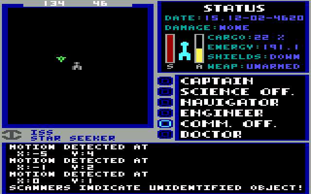 Starflight begins aboard a circular starbase orbiting the player’s familiar-sounding home planet of Arth. From here, personnel files can be created and accessed, and the important roles aboard the starship assigned. This amounts to six critical – and recognizable – positions: engineer, navigator, communications, science officer, doctor, and captain. Across the rotunda is the Interstel operations room, and starting the game will instigate an informative notice from the corporation. Here, in black type, are the instructions and primary objectives of this space adventure, and an obvious indicator of Starflight’s chief influence: “At this stage of the operation our primary goal is to gather information,” states the notice, before listing the eight goals of the mission.