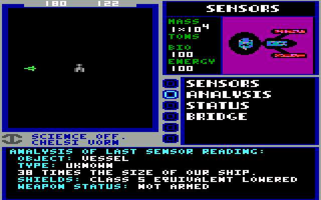 Despite a 1982 arcade game from SEGA (punchily titled Star Trek: Strategic Operations Simulator) that lent a beautifully clean vector display to the starship battles, there was precious little gaming for Trekkers during the ’80s, bar publisher Simon & Schuster with text adventures that eschewed graphics almost as much as that innocent mainframe effort from 15 years earlier. The untapped world of Star Trek waited for the game that would most do it justice: a space-based exploration story where the player combined tasks such as managing a crew, discovering new worlds, negotiating with aliens, and combating them where necessary.