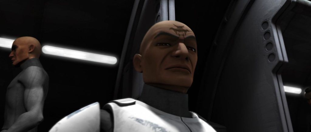 Now, check out CT-9544, aka Scythe. He’s a Clone Trooper from the second season of Clone Wars, particularly in ‘Brain Invaders’ (S2, Ep8) in which his grey matter is infiltrated by a Geonosian brain worm. Oh – and what’s that on his forehead? That’s right, a tiger skull tattoo, which looks remarkably like Trelak’s just with a different material. Both got a parasite, both got the same-looking kind of thing on their head.
