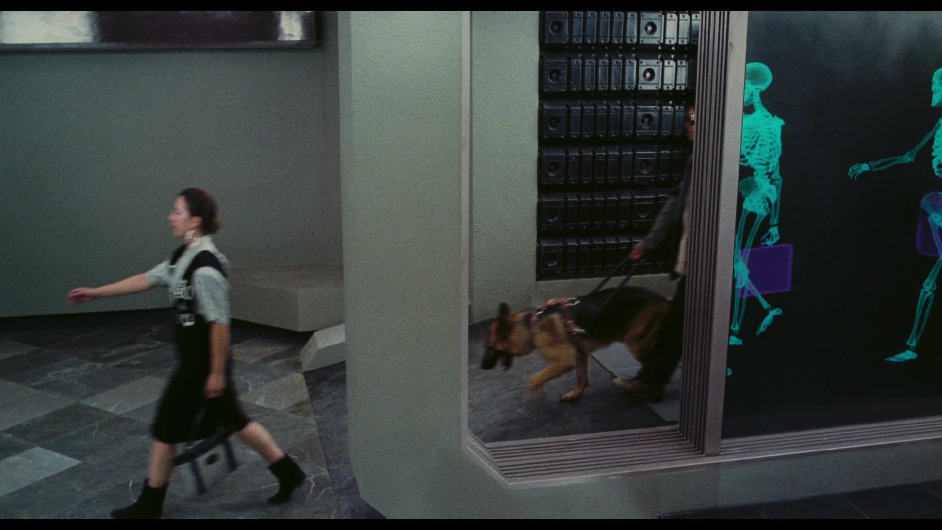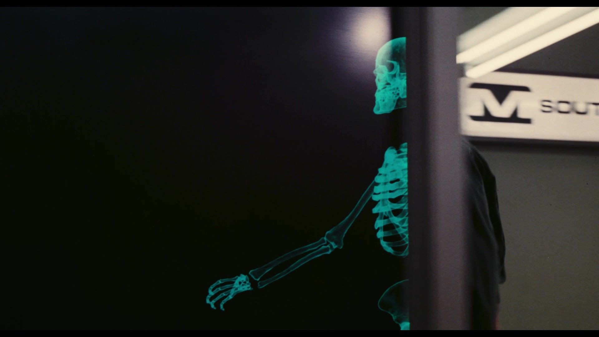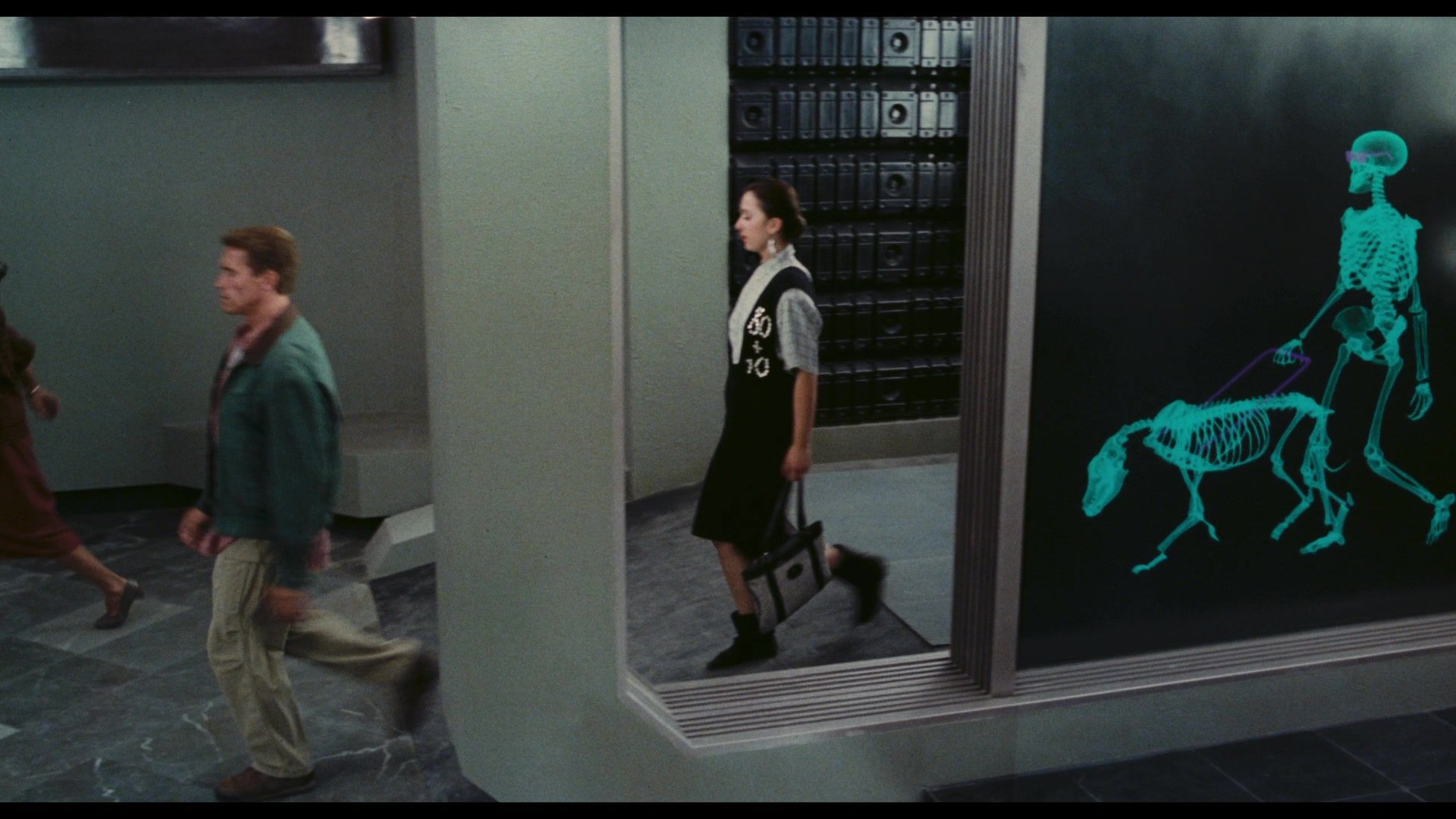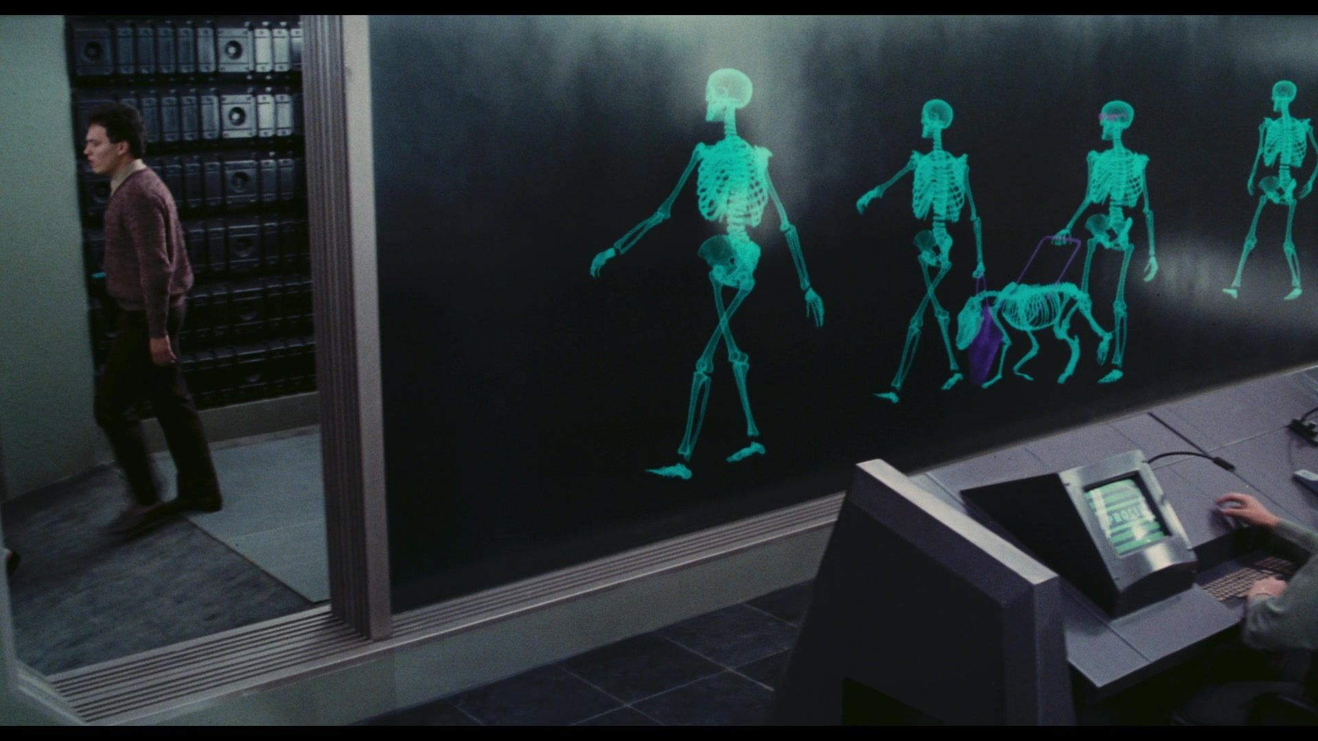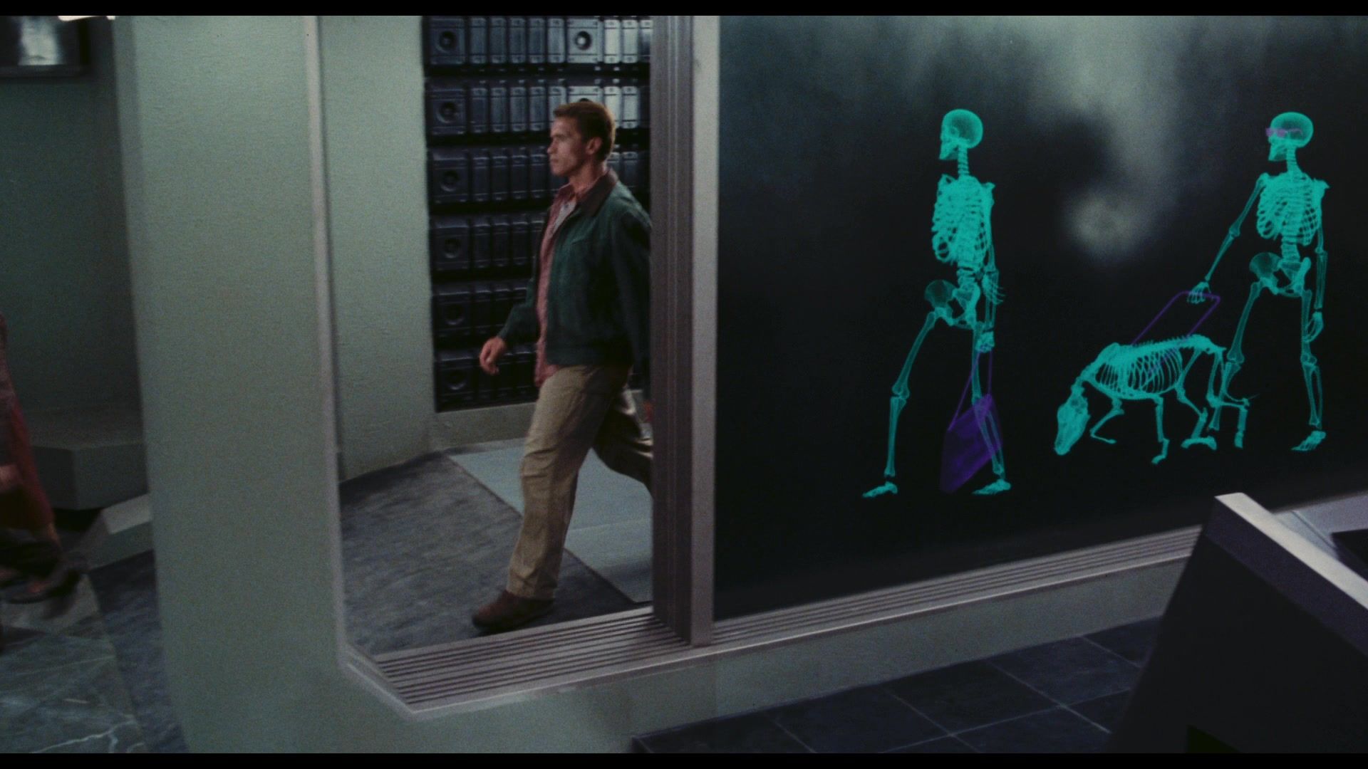 Though the complexity of Quaid’s escape required McGovern to be on set, an earlier sequence with the subway scanner was simple enough to be done remotely as Quaid mooches through as one of a line of commuters, including a blind man with his seeing-eye dog. As it was a simpler shot – no turning and racing towards the camera, just transit from left to right – these nonchalant skeletons didn’t require the dubious aid of motion capture but instead were rotoscoped from footage shot from the other side of the machine’s painted glass screen.